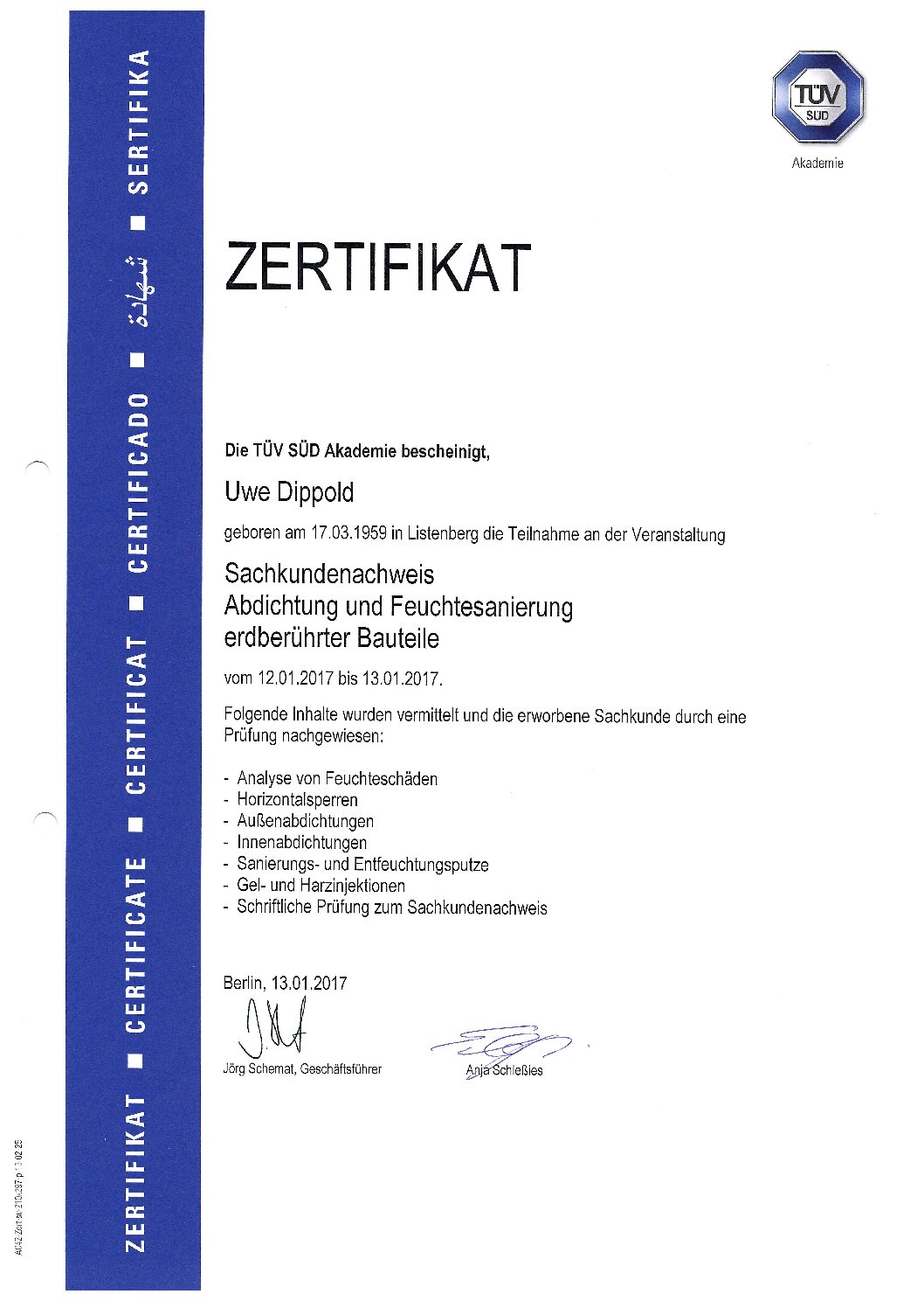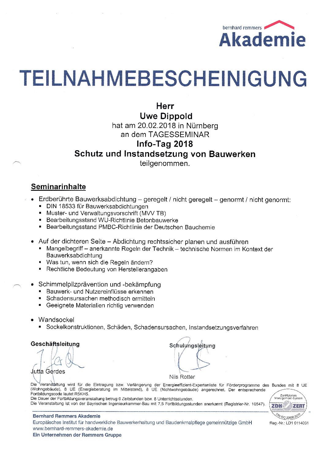 | Seit 2018 | TÜV-geprüfter Sachkundiger zur Abdichtung und Feuchtesanierung erdberührter Bauteile VDB-gepürüfte Fachkunde für das Messen von Belastungen mit Asbest, KMF sowie von VOC und SVOC |