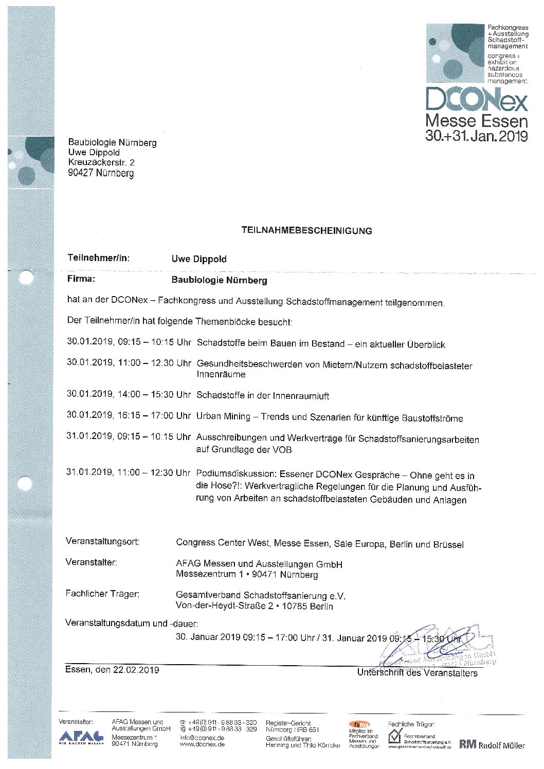 | Seit 2012 | Baubiologe IBN, Beratungsstellenbetreiber des IBN Desinfektor, staatlich geprüft nach § 17/3 Infektionsschutzgesetz mit jährlich besuchtem Auffrischseminar Vollmitglied im Verband der Deutschen Baubiologen VDB |