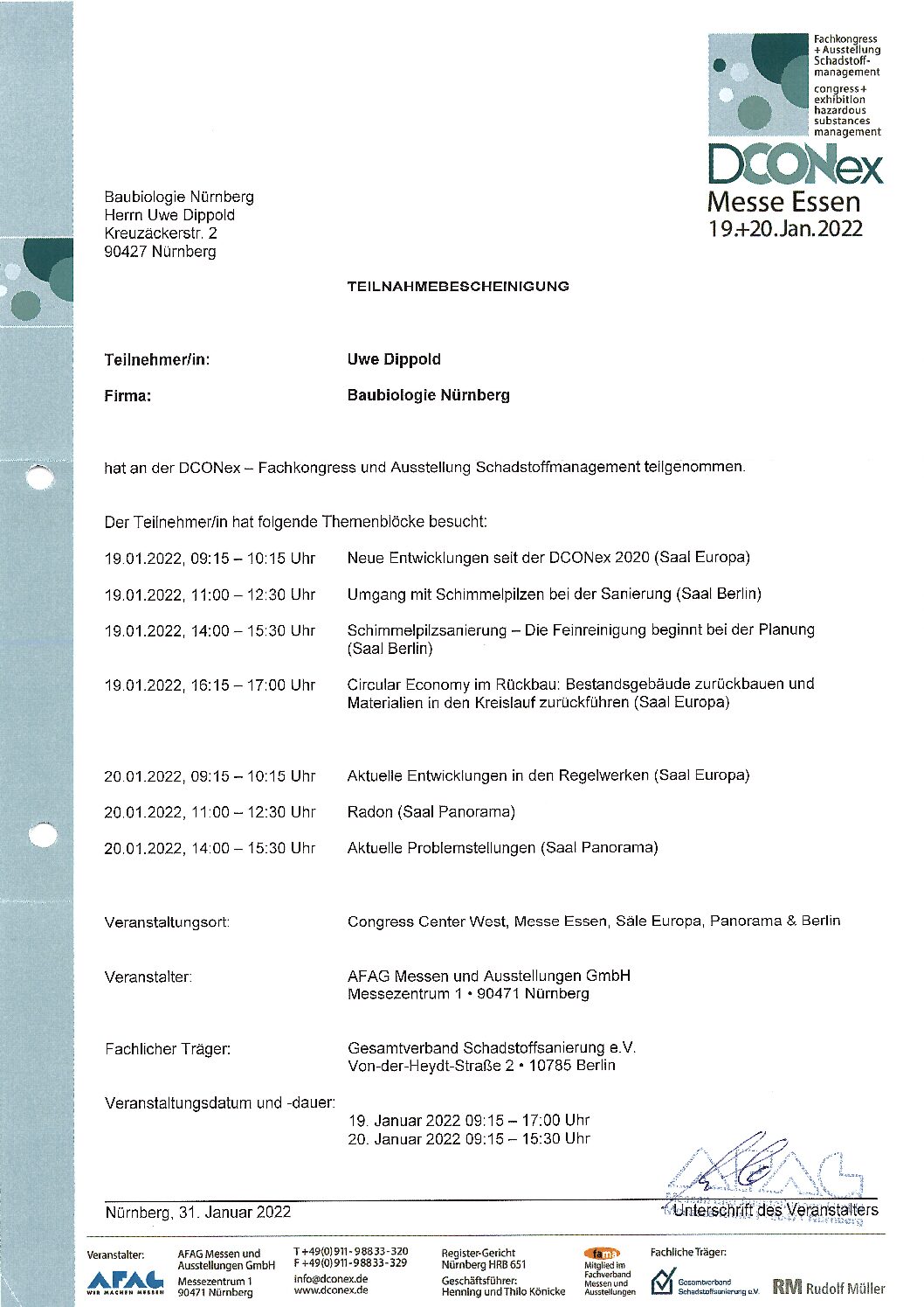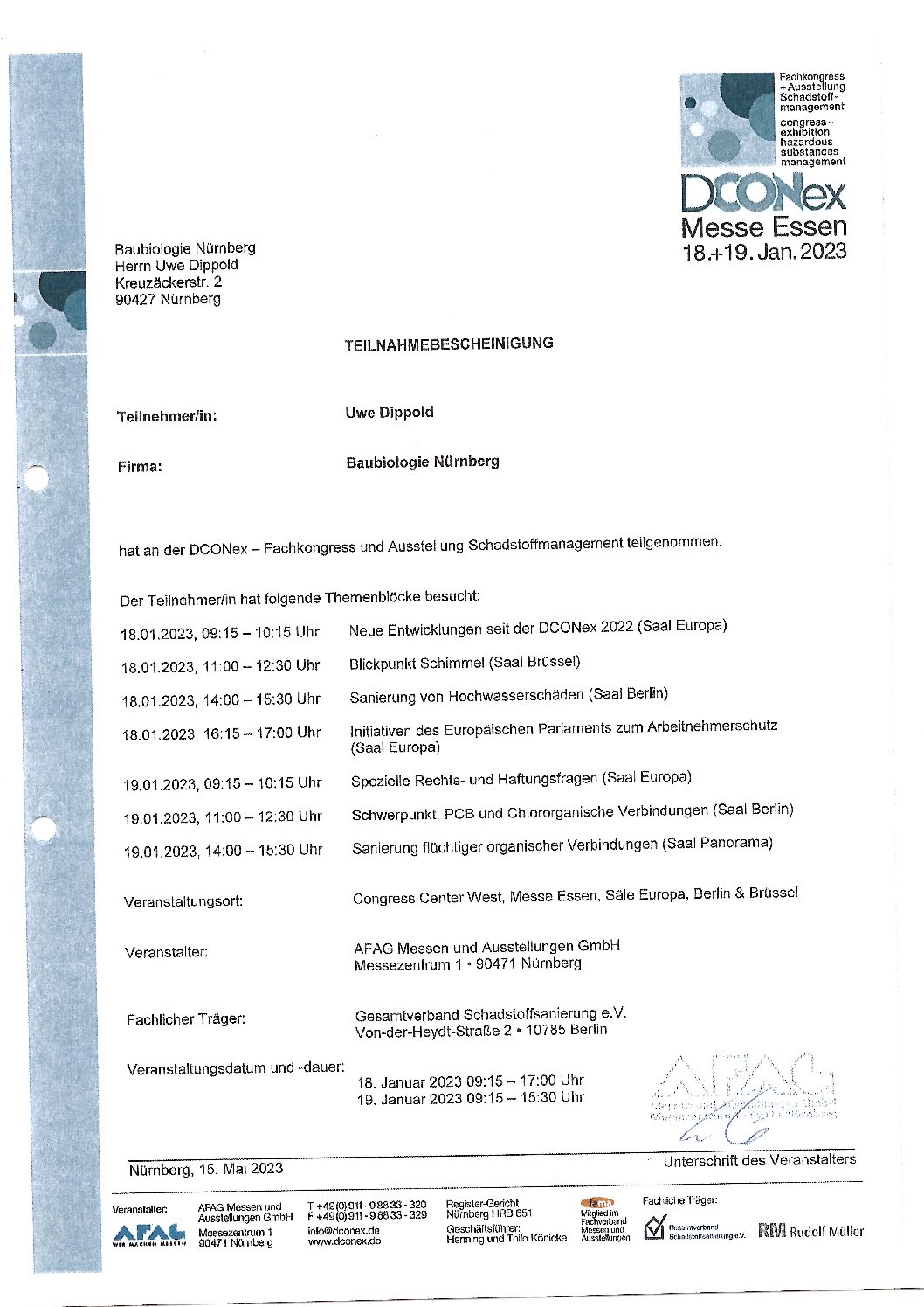 | Mitte 2004 | Weiterbildung an der BauAkademie Nürnberg zum Berater bei Schimmelpilzen und Wohngiften in Innenräumen. |